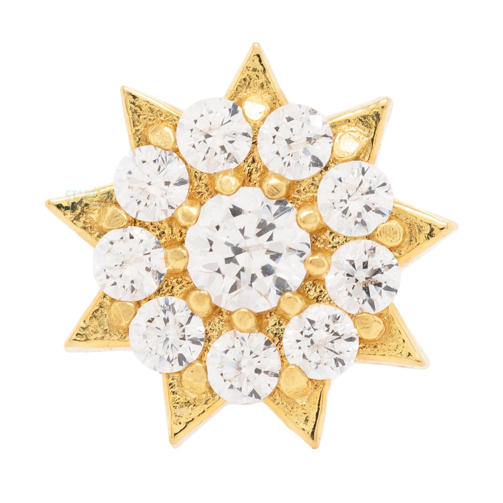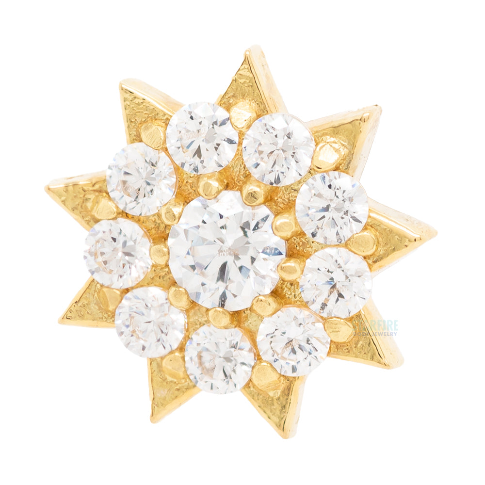 The textured glow of this hammered finish starburst allows these prong set faceted gemstones to shine so bright.