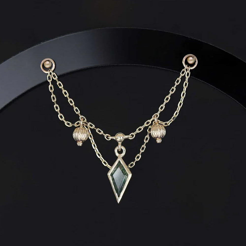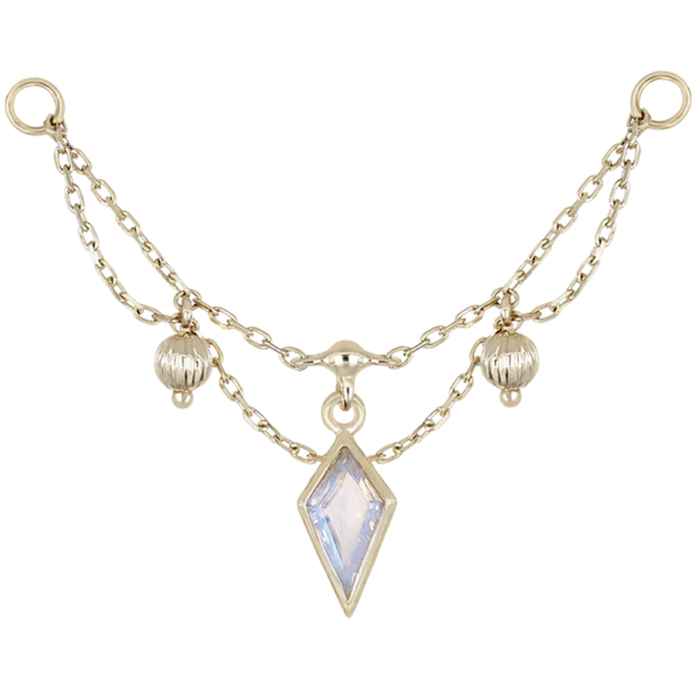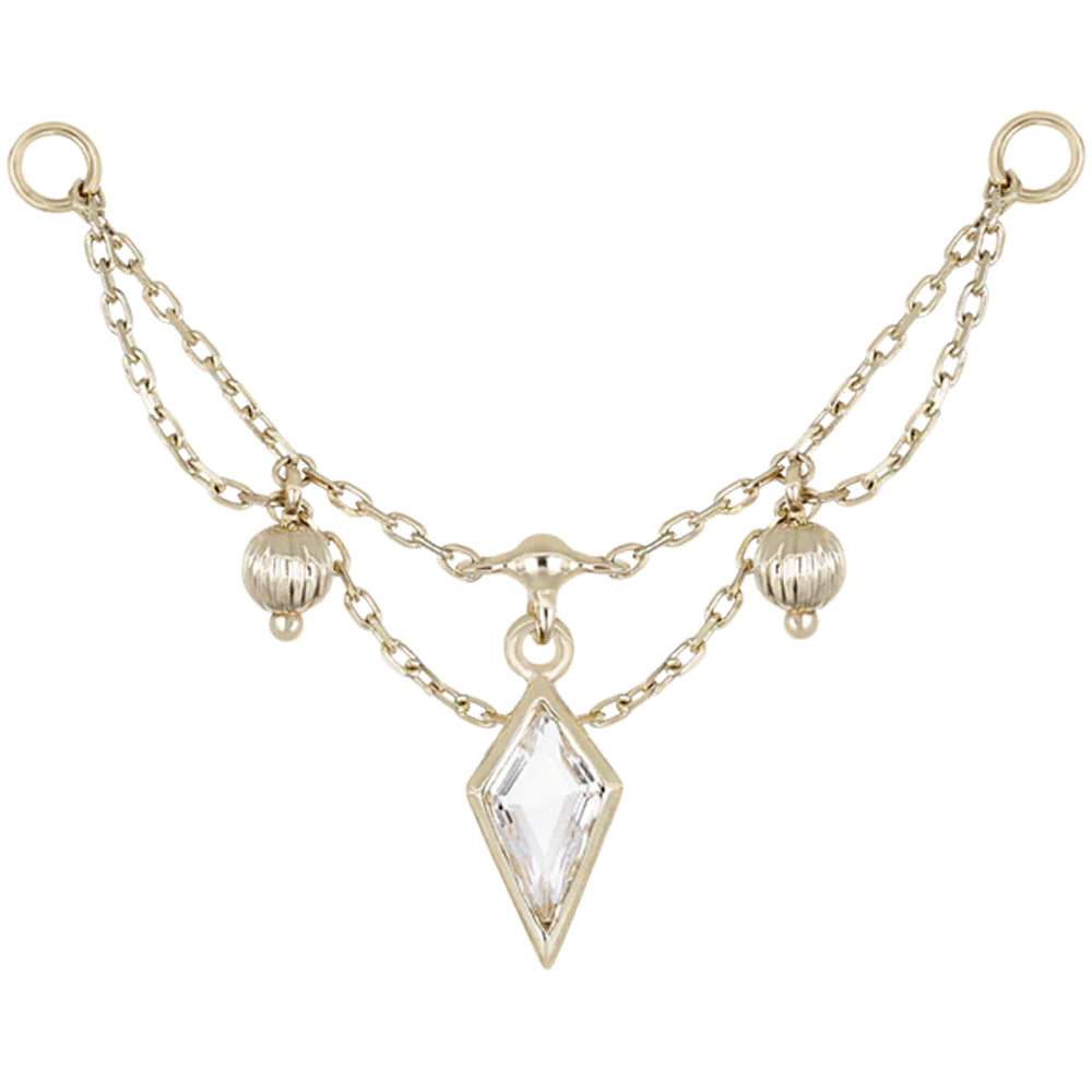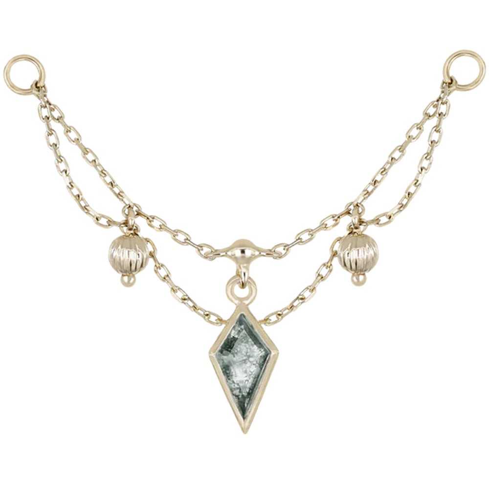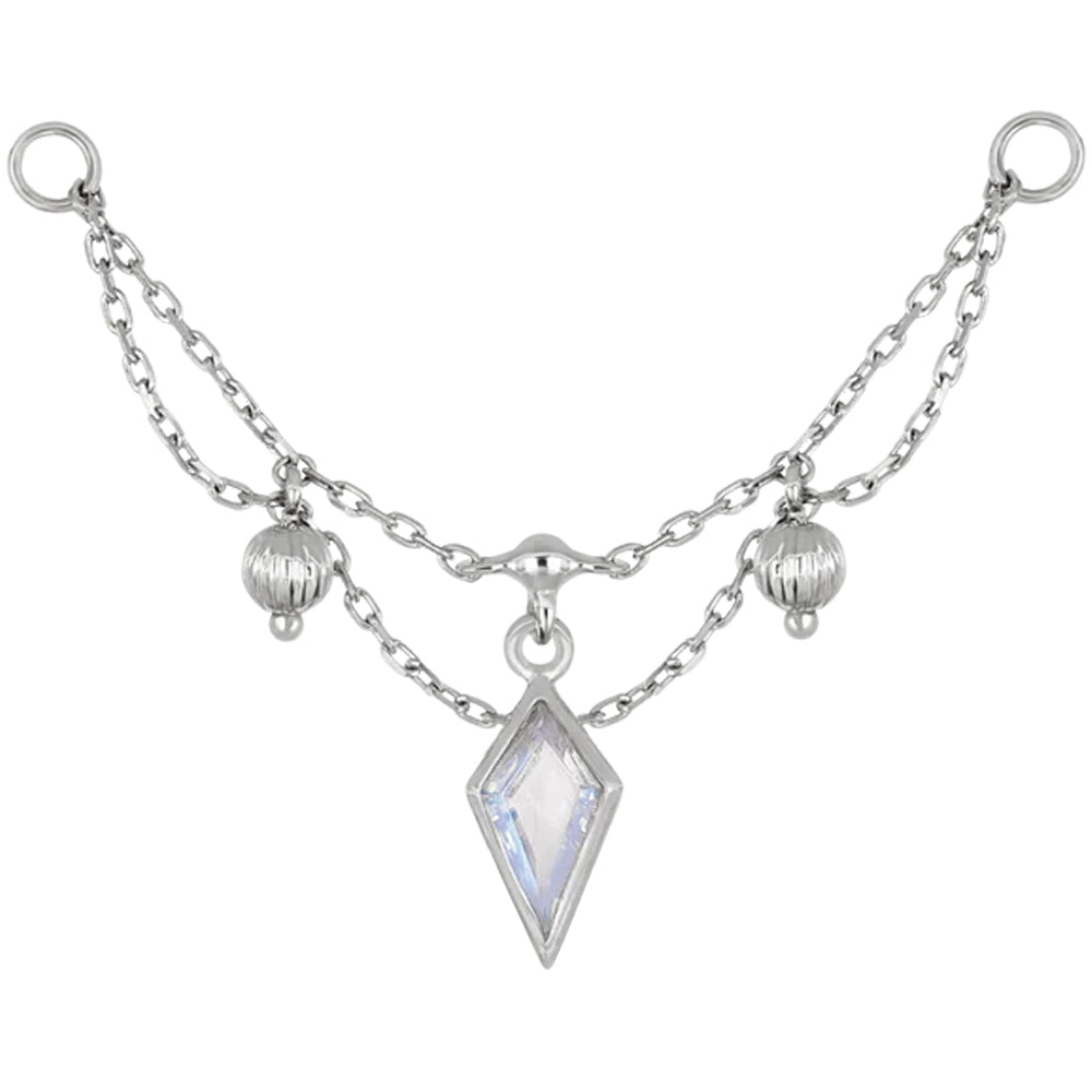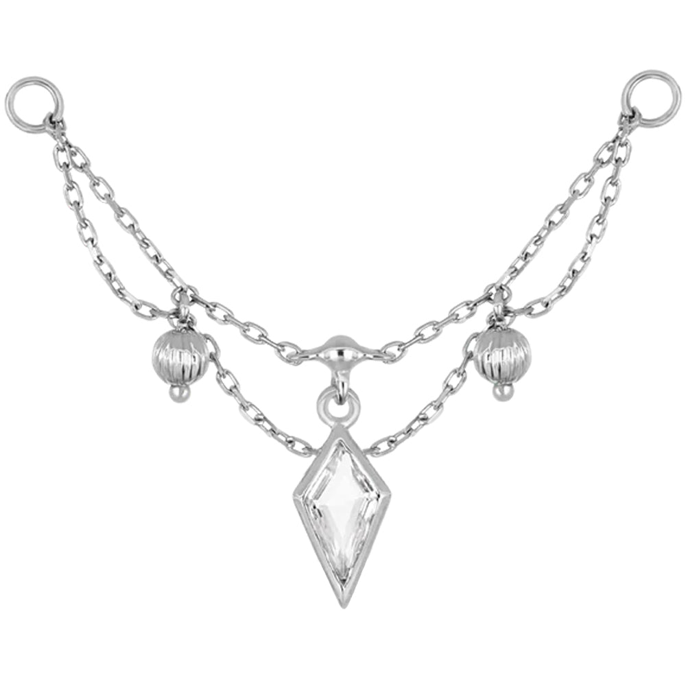 "Vitam" is a truly elegant chain attachment featuring a remarkable kite cut gem in center surrounded by beautiful draping chains and textured bead accents.