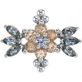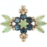 - 14mm x 11m threaded end with (6) 3mm x 1.5mm Marquise-Cut Sandblasted Faceted Chrysoprase in Prong's, (5) 2mm Round London Blue Topaz AA surrounding (1) Round Sandblasted Faceted Chrysoprase in Prong's with tri-bead accents