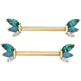 "French Kiss" Forward Facing Nipple Barbells in Gold with Seafoam Tourmaline, Sandblasted Swiss Blue Topaz & DIAMONDS