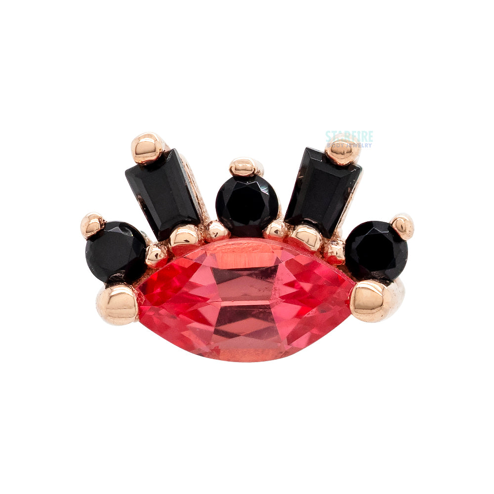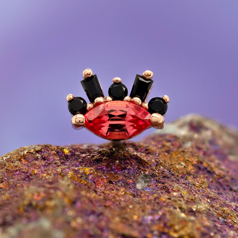 • 6mm x 5mm threaded end with (1) 4mm x 2mm Marquise-Cut Padparadscha Sapphire, (2) 1.25mm x 1mm x 0.75mm Faceted Onyx Tapered Baguettes & (3) 1mm Round Faceted Onyx in Prong's