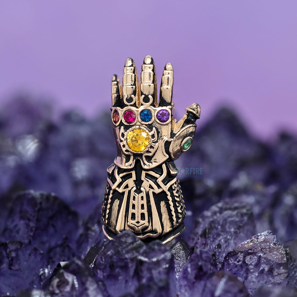 This antiqued gemstone encrusted Infinity Gauntlet is the perfect accessory for any Marvel fan!