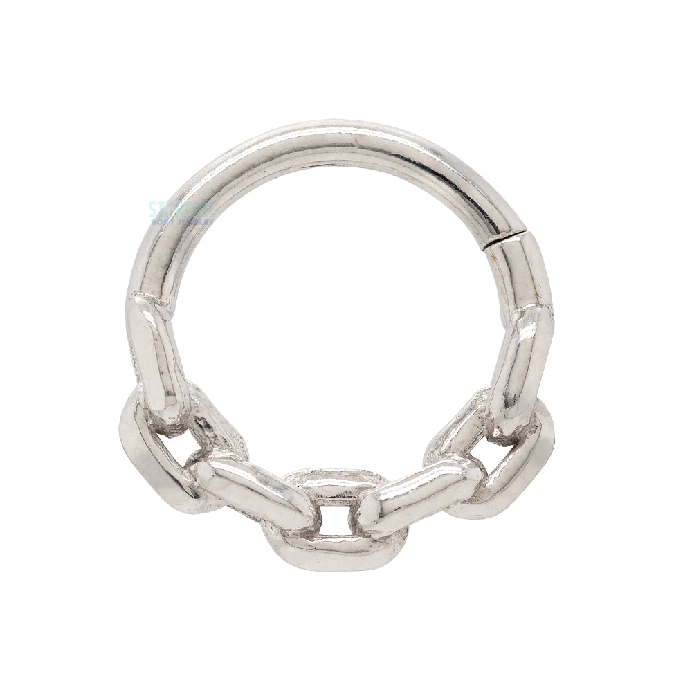 The decorative side of this continuous ring is made up of tiny solid gold links of chain.