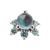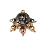 • 5.5mm x 6mm threaded end with (1) 3mm Round Pyrite accented by (2) 1.5mm Round Smoky Quartz, (2) 1.25mm Round Grey Diamond & 1mm Round Champagne Diamond in Prongs