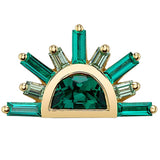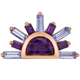 Experience the beauty of a breathtaking sunset. Adorned with stunning baguette-cut Amethyst and Tanzanite gems circling around a half moon gem.