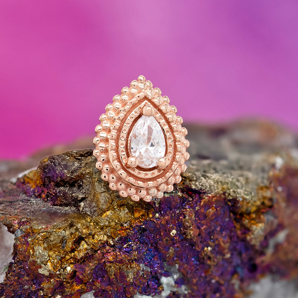 - Tiny: 7mm x 5mm threadless end with (1) 3mm x 2mm Pear-Cut White CZ in Prong's and a millgrain edge