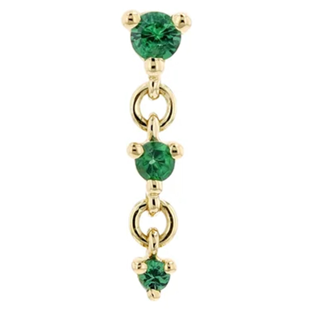 Love this special sparkly piece in green (favorite color) tsavorite. The color pops nicely while still being dainty. The 3rd stone gives it just the right length for the upper part of my ear.