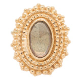 The Afghan Oval features a vibrant Chatham Emerald surrounded by the layered beadwork we all love.