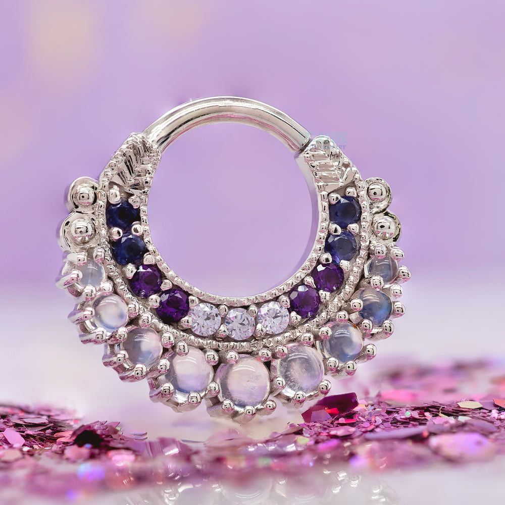 "Marilyn" Hinge Ring in Gold with Rainbow Moonstone, Iolite, Amethyst & Lavender CZ