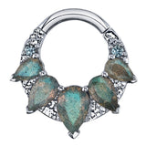 - (1) 6mm x 4mm Faceted Labradorite Pear in Prongs, surrounded by (2) 5mm x 3mm Faceted Labradorite Pears in Prongs, (2) 4mm x 2.5mm Faceted Labradorite Pears in Prongs & (2) 1.5mm Round Grey Sapphires AA in Prongs