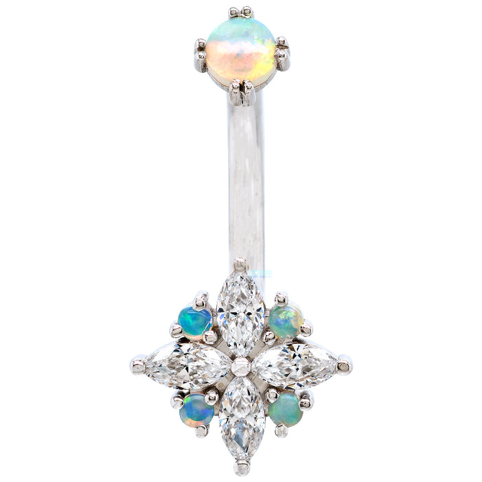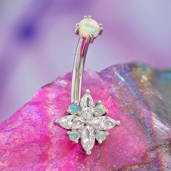 "Pleades" Navel J Curve in Gold & Platinum with White CZ & Genuine White Opals
