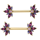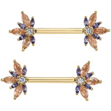 Shine like a star with these starburst design nipple barbells adorned with fun a fun combo of orange and purple gemstones. And the threadless "narwhal bb" style makes inserting and removing this jewelry a breeze!