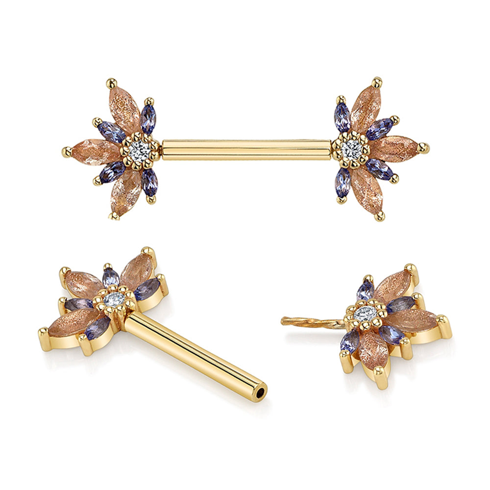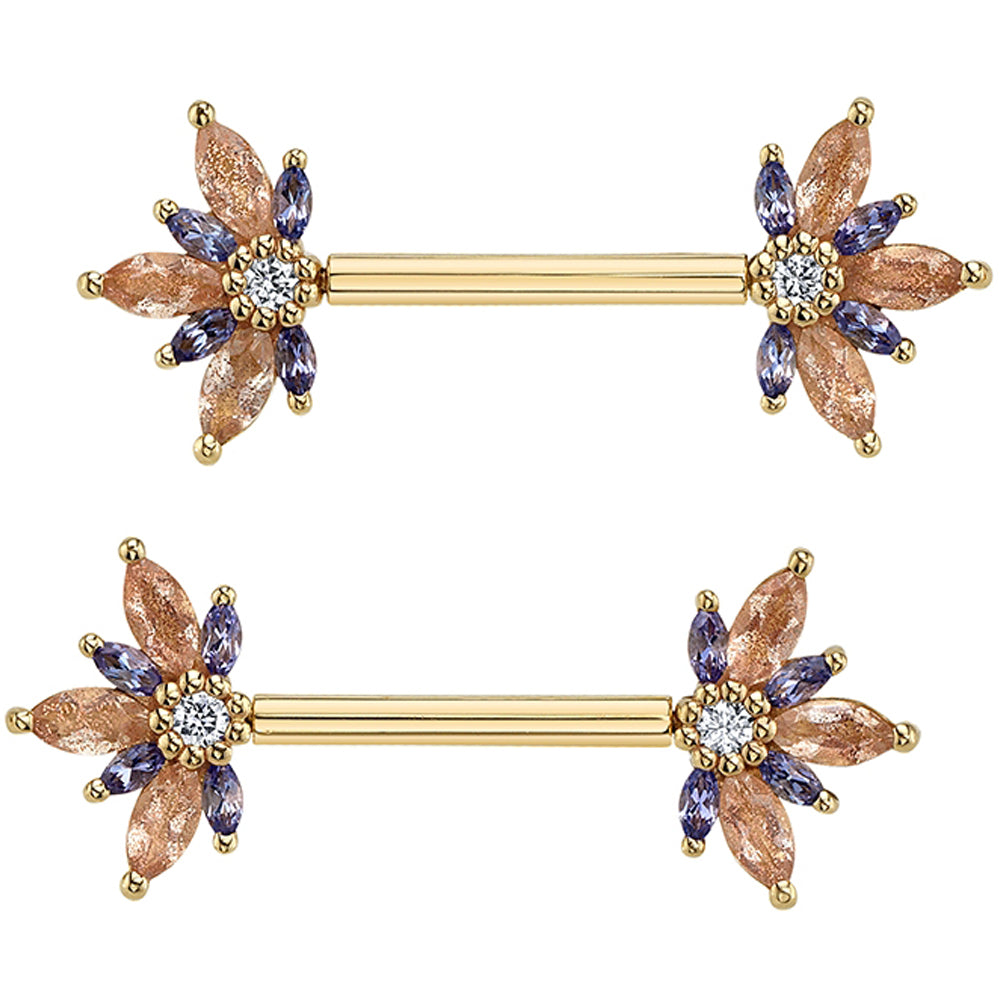 threadless: "Starling" Forward Facing Nipple Barbells in Gold & Platinum with Oregon Sunstone, Tanzanite & Diamond
