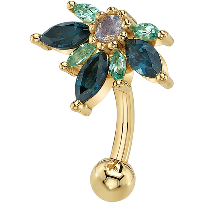 "Starling" Top Loader Navel Curve in Gold & Platinum with London Blue Topaz, Chatham Chrysoberyl & Labradorite