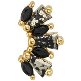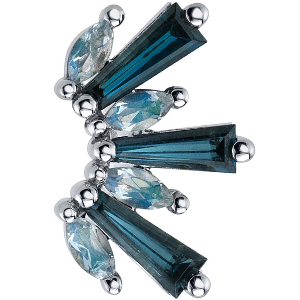 - Large: 15mm x _mm threaded end with alternating (3) 5mm x 2mm x 1mm London Blue Topaz Tapered Baguettes & (4) 4mm x 2mm Marquise-Cut Rainbow Moonstones in Prong's