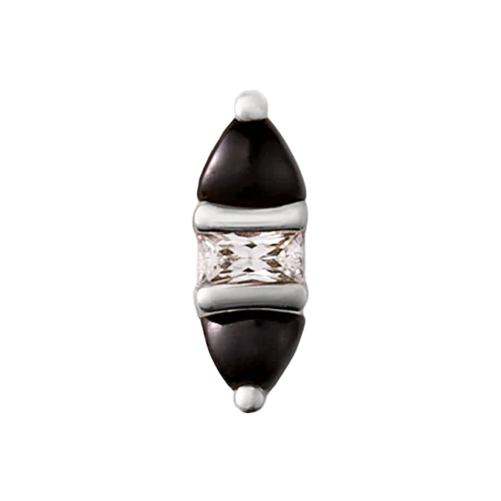 The "Innuendo" balances bold contrast with subtle shine with it's baguette White CZ nestled between two Black Spinel.