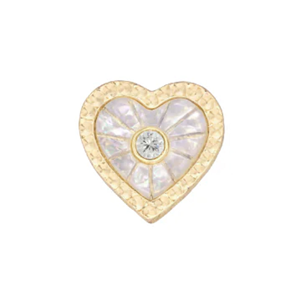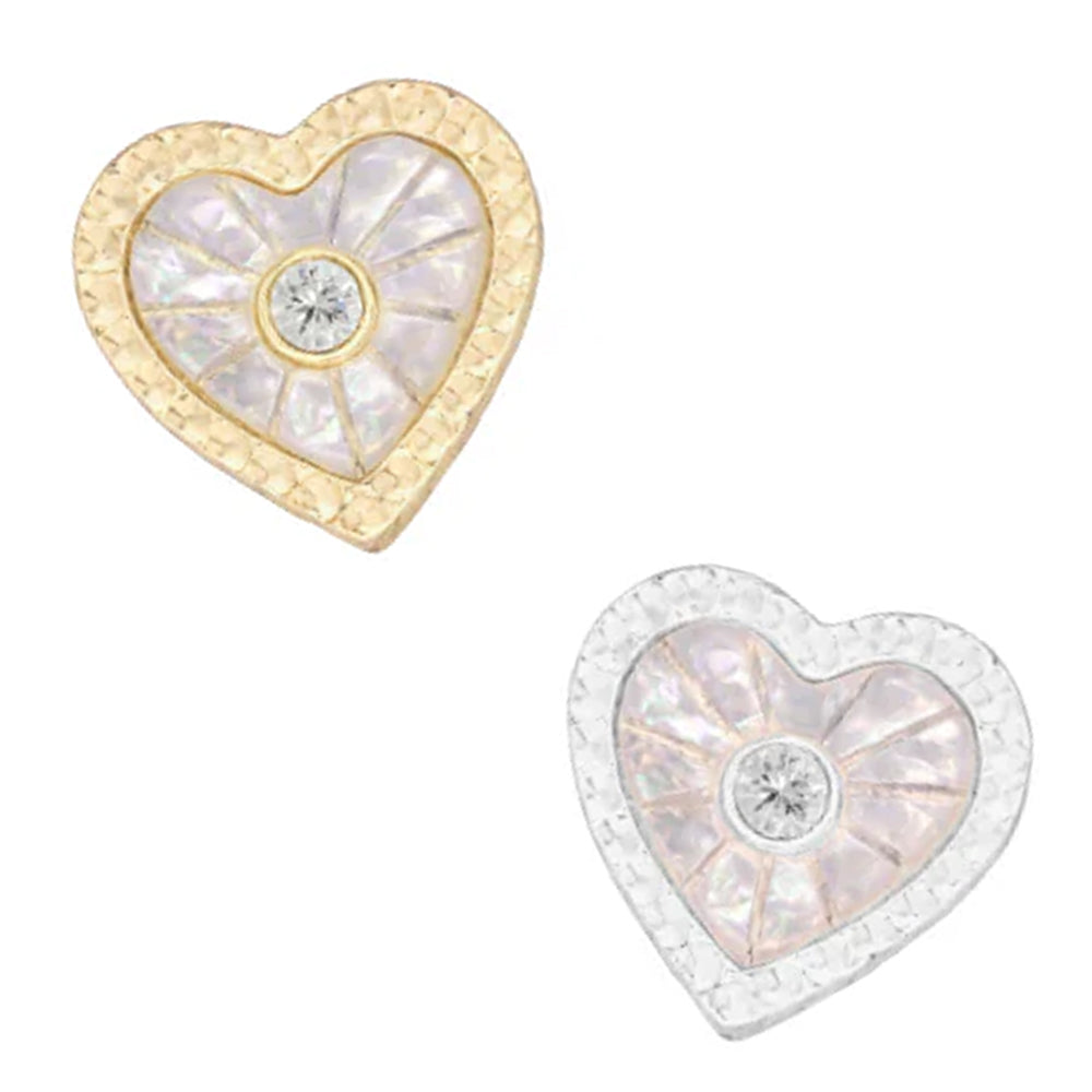 Marbell is here and ready to steal the show! This flirty heart features a textured edge with iridescent mother of pearl inlay that shimmers with every move, paired with a dazzling center gemstone!