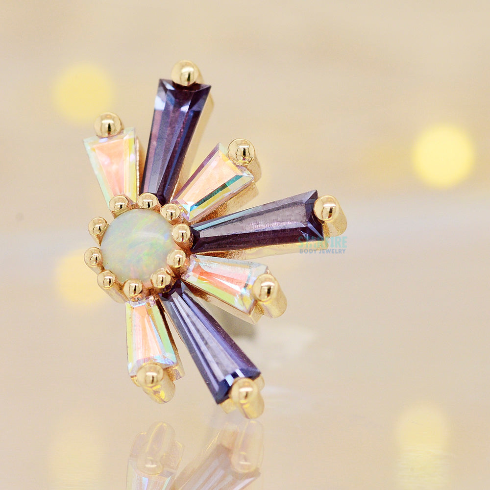 - Supernova: 14mm threaded end with (3) 5mm x 2mm x 1mm Chatham Alexandrite Tapered Baguettes & (4) 3mm x 2mm x 1mm Mercury Mist Topaz Tapered Baguettes surrounding (1) 3mm Round Genuine White Opal AAA in Prong's
