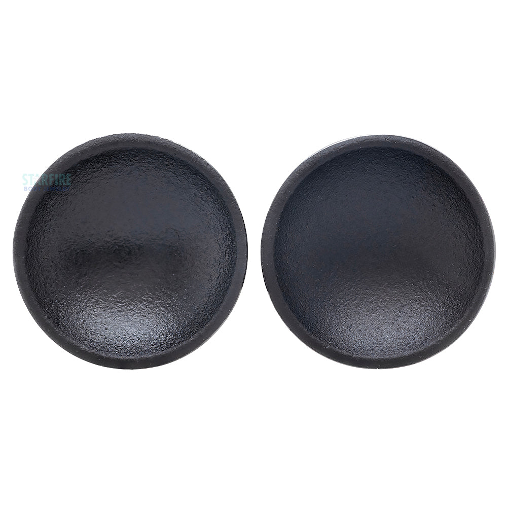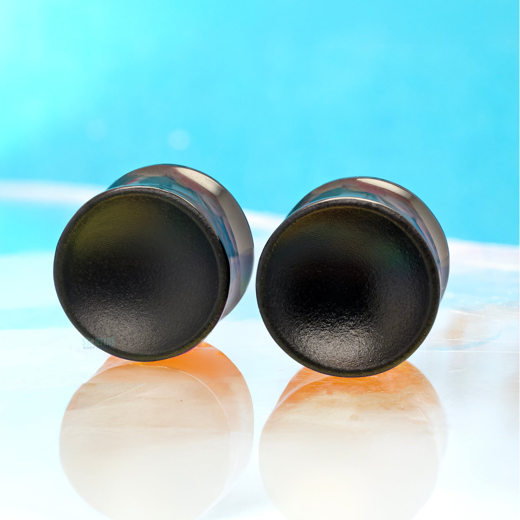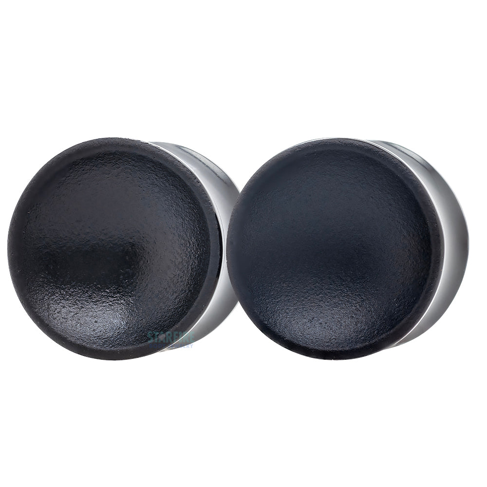 These Volcanic Glass plugs have a subtle concave design. One side is surface treated with a matte black finish, while the other side is a gloss finish.